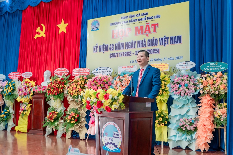 Phát biểu tại buổi họp mặt, thay mặt Ban Giám Hiệu Nhà trường, TS. Nguyễn Thanh Sang, Hiệu trưởng gửi lời chúc mừng, tri ân đến quý thầy cô và trân trọng cảm ơn lãnh đạo tỉnh, các sở, ban, ngành, các công ty, doanh nghiệp, ngân hàng và cơ quan báo chí, truyền thông đã luôn quan tâm, đồng hành và hỗ trợ Nhà trường. Thầy bày tỏ lòng kính trọng và biết ơn sâu sắc đến các thế hệ nhà giáo; đồng thời ghi nhận và biểu dương tinh thần nỗ lực, sáng tạo của toàn thể giảng viên, viên chức đã góp phần xây dựng Trường Cao đẳng nghề Bạc Liêu ngày càng phát triển.
