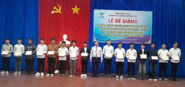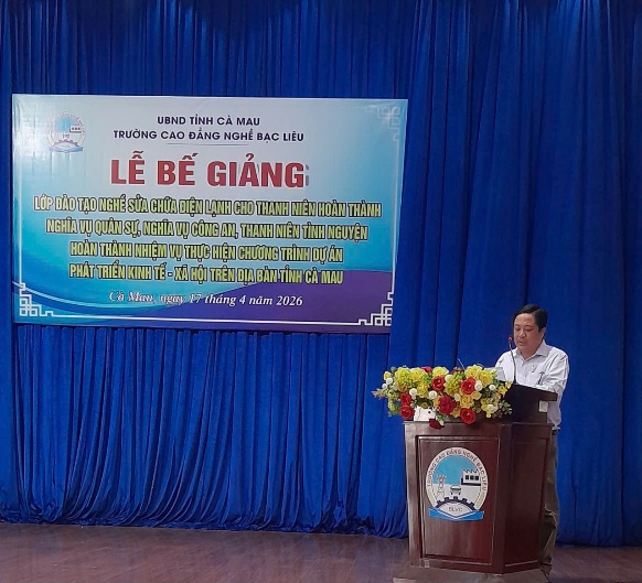 Sáng ngày 17/4/2026, tại Hội trường, Trường Cao đẳng nghề Bạc Liêu đã tổ chức Lễ Bế giảng lớp đào tạo nghề Sửa chữa điện lạnh dành cho thanh niên hoàn thành nghĩa vụ quân sự, nghĩa vụ công an, thanh niên tình nguyện hoàn thành nhiệm vụ thực hiện chương trình dự án phát triển kinh tế - xã hội trên địa bàn tỉnh Cà Mau.